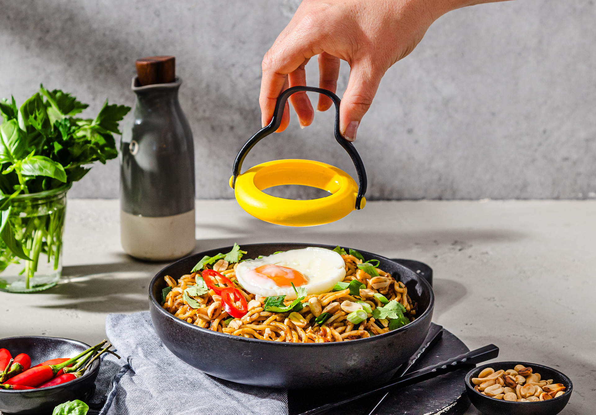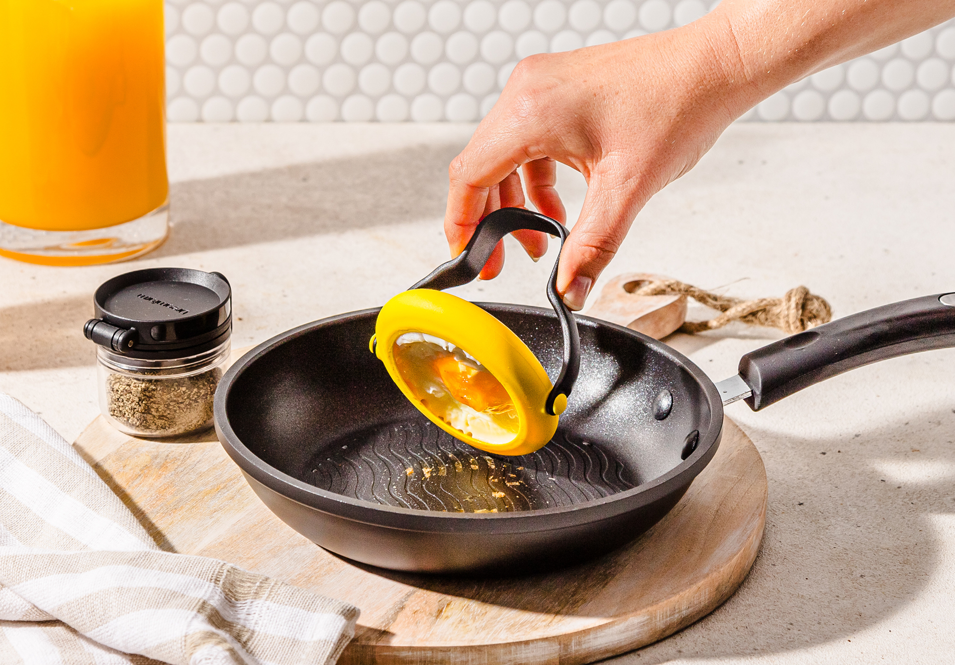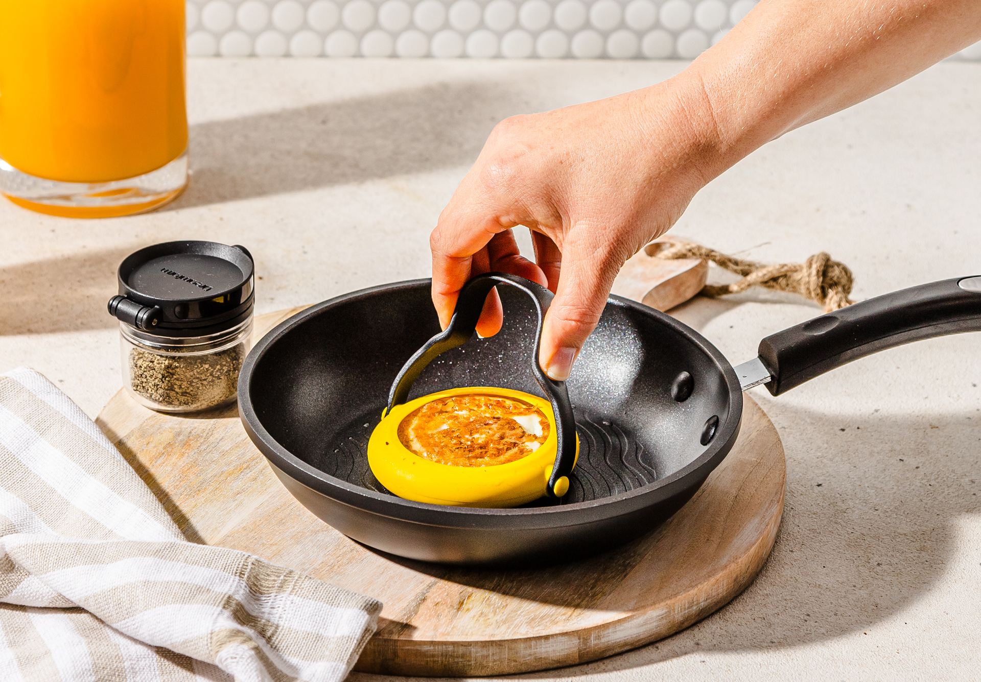 Squeezing the flexible handle changes the shape of the ring to release the cooked egg directly onto your toast or plate.