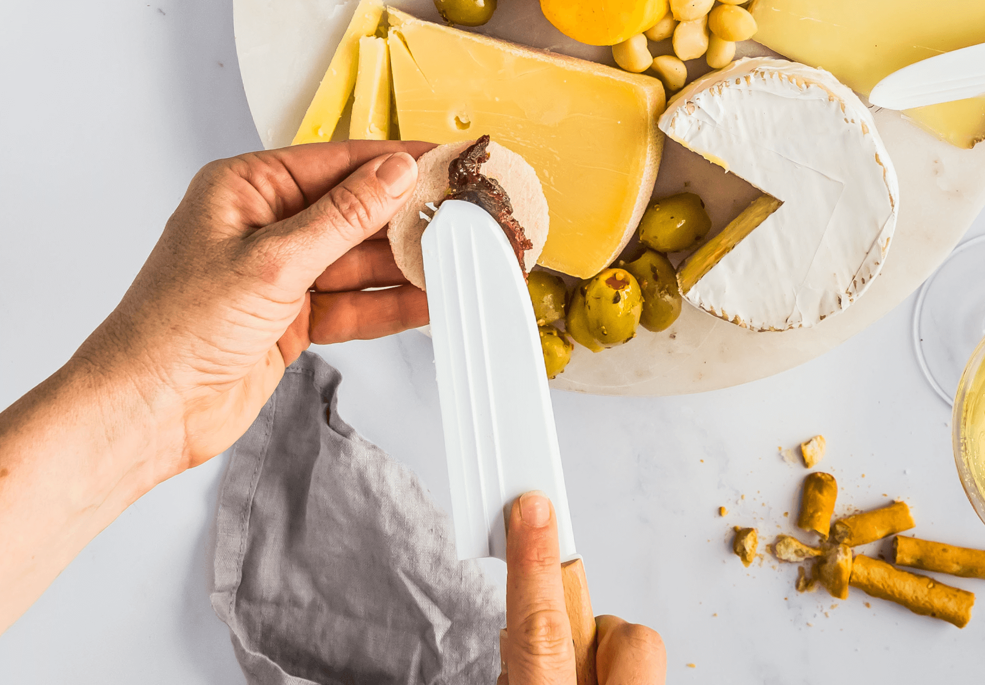 The forks at the end of the Knibble blade help you poke and pick up meats, cheeses, olives, sun dried tomatoes, or any other nibbles you have on your cheese platter!