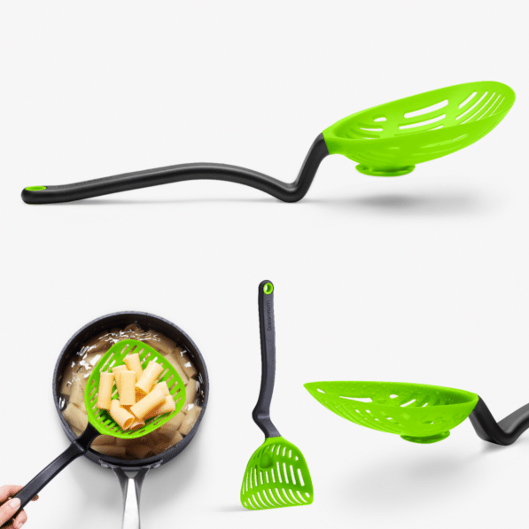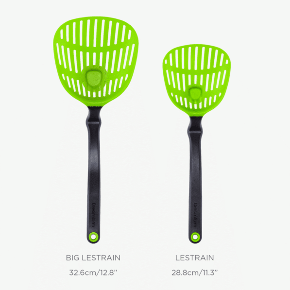 Lestrain is a scoop strainer that catches its own drips and sits up off your counter.