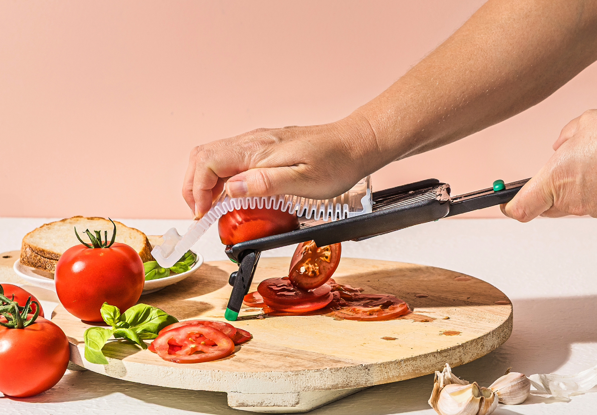 Nocutu’s unique finger guard runs on tracks to safely cut right down to the last slice.