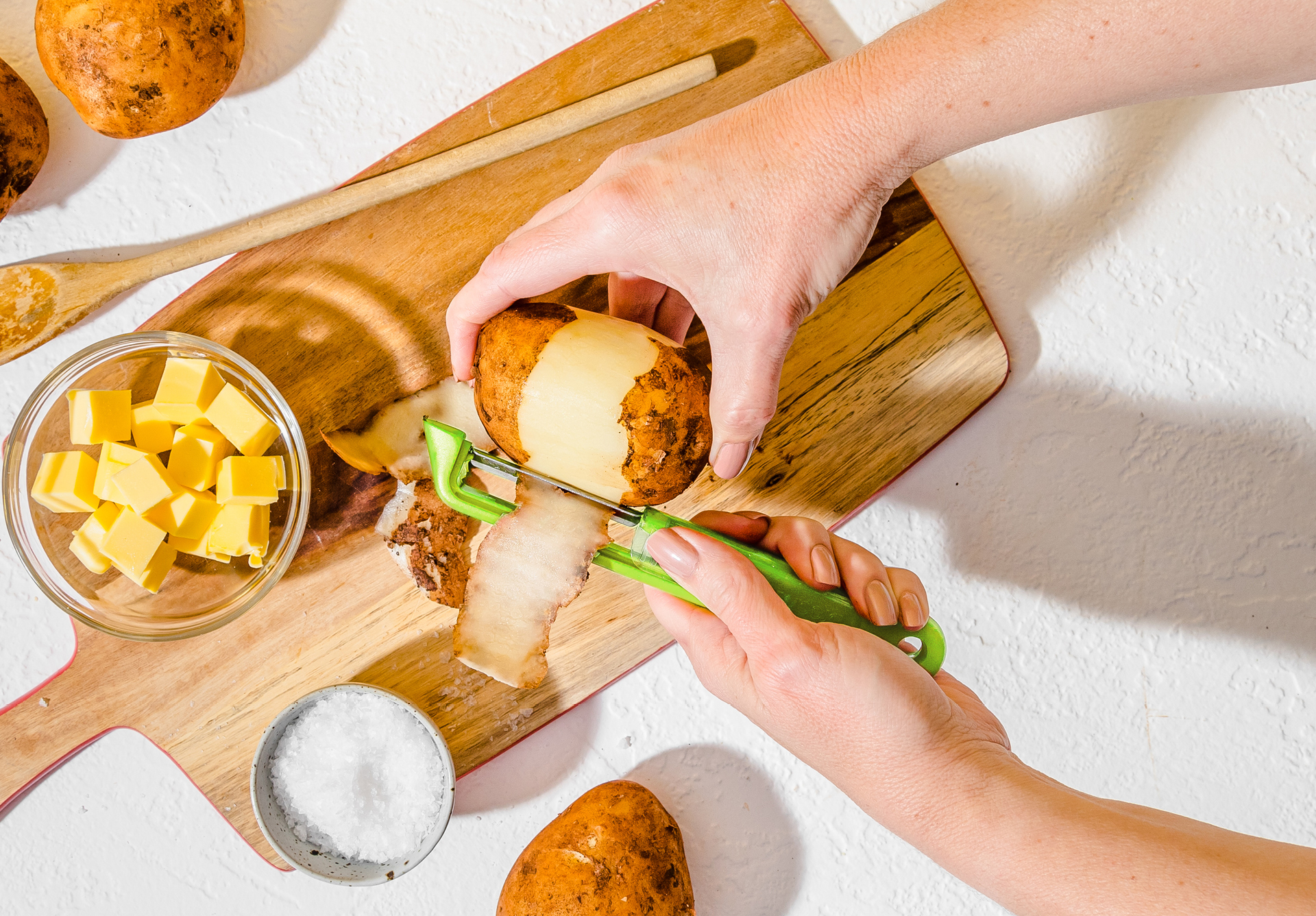 Handle tip includes a convenient and highly effective potato eye and blemish remover.